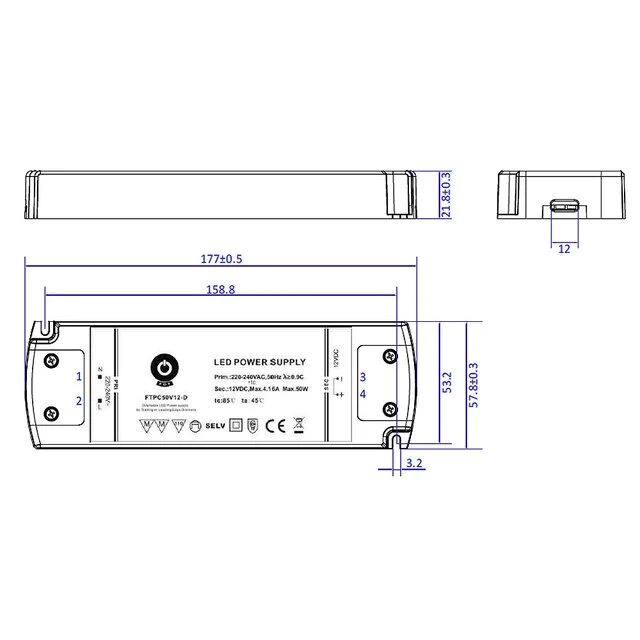 Wij adviseren om deze voeding nooit maximaal te belasten. Wij adviseren om altijd minimaal 10% overcapaciteit te hebben. d.w.z. een belasting van niet meer dan 80% / 90% ten aanzien van het maximale vermogen. Binnen de LED wereld heet dit nominale belasting. Voor deze compacte LED voeding is de nominale belasting van 72 watt.Het product bevat de volgende certificeringen: