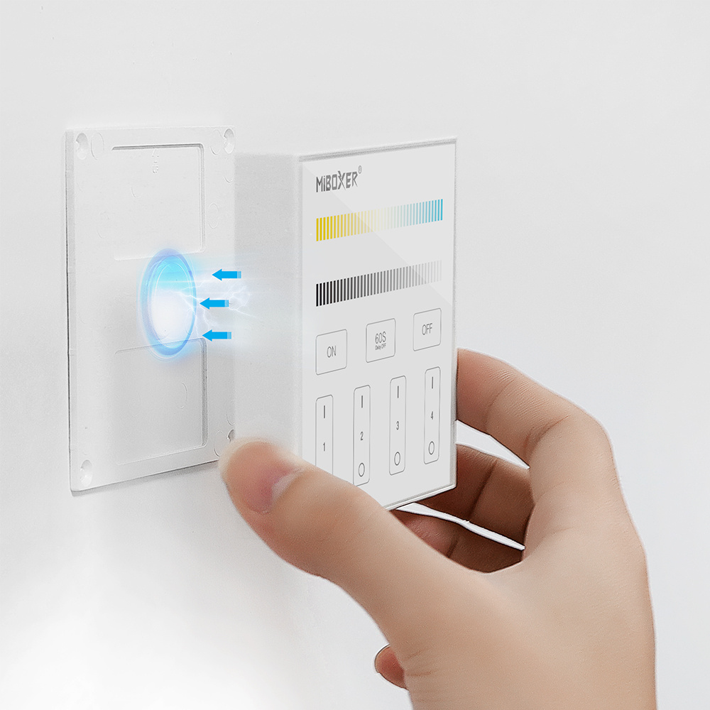 Draadloze LED wanddimmer voor dual white LED verlichting en LED strips, werkt tot 30 meter! Voor iedere zone is een aparte LED controller nodig. Werkt met alle miboxer 5-in-1 LED controllers. Voor CCT / Dual White LED strips en LED spots