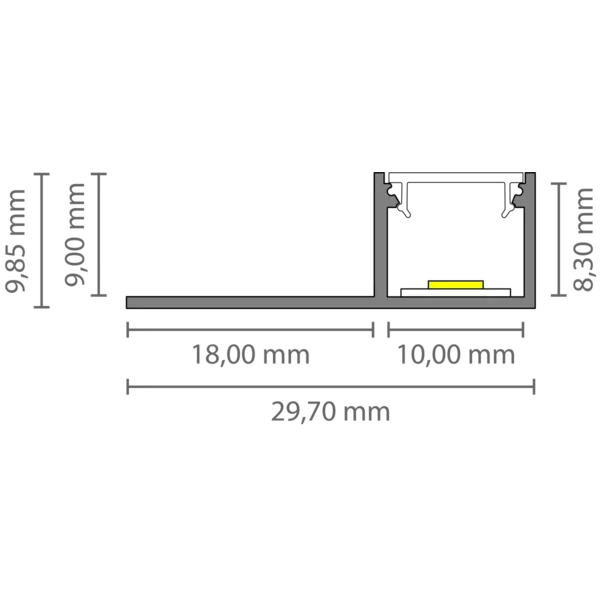 De afmetingen van dit LED profiel zijn 1000 / 2000mm x 29,70mm x 9,85mm hoog.