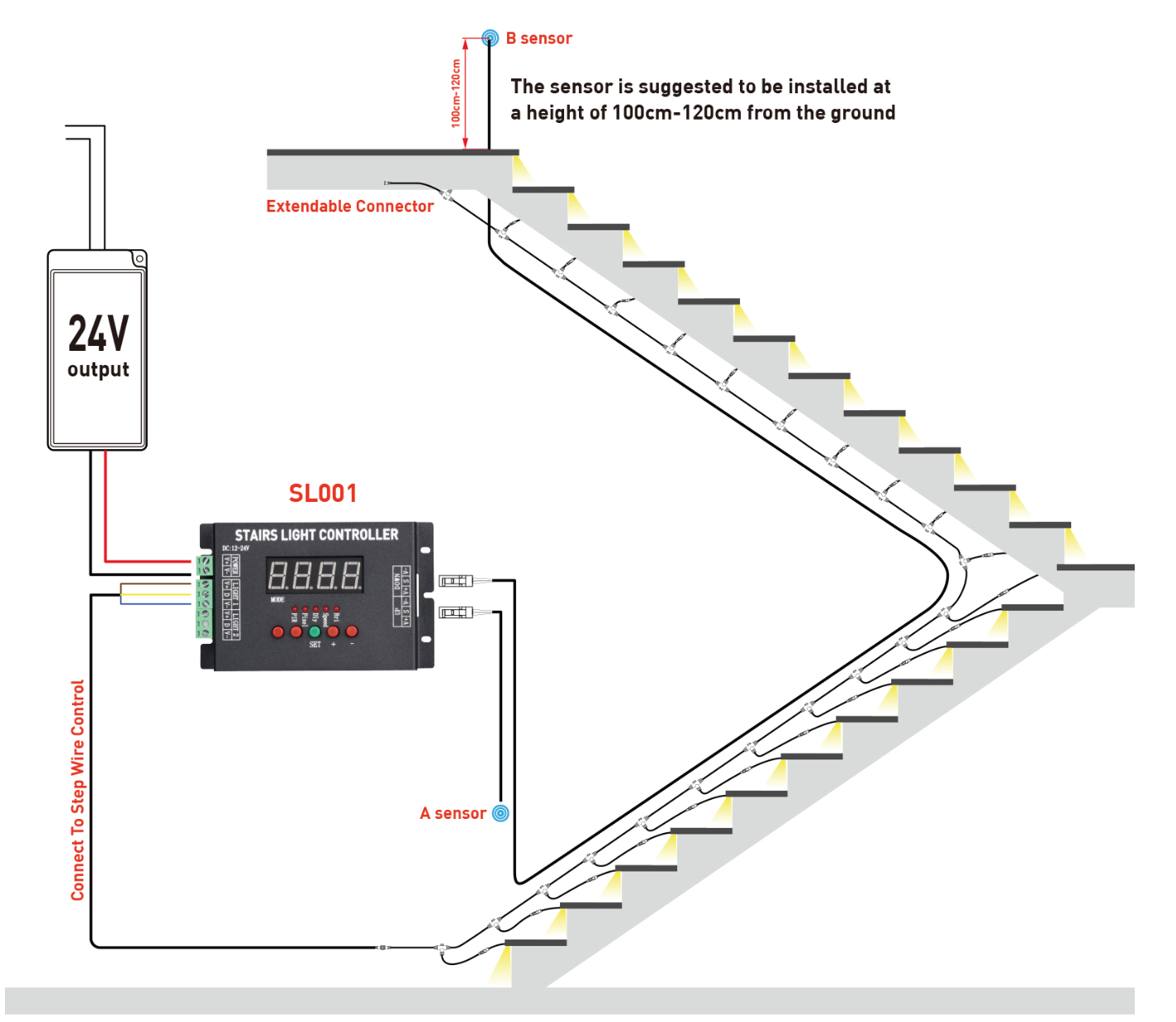 Wij adviseren bij deze traptrede LED controller een LED strip met een minimaal wattage van 6 watt per meter aan te houden u bent vrij in de keuze om een 12 of 24 volt LED strip of LED lamp te gebruiken. Het voordeel van een LED strip met een hoger wattage en een hoge lumen output zorgt ervoor dat u naar wens kunt spelen met de gewenste lichteffecten en lichtsterktes. U kunt onze LED strips afhankelijk van het type op iedere 5 a 10 centimeren met een schaar afknippen (dit staat op de strip aangegeven). Het aansluiten van de LED strip of LED lamp is tevens zeer eenvoudig.