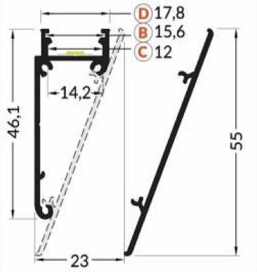 - L/B/H: 2000 mm x 55 mm x 23 mm (buitenmaten driehoek)