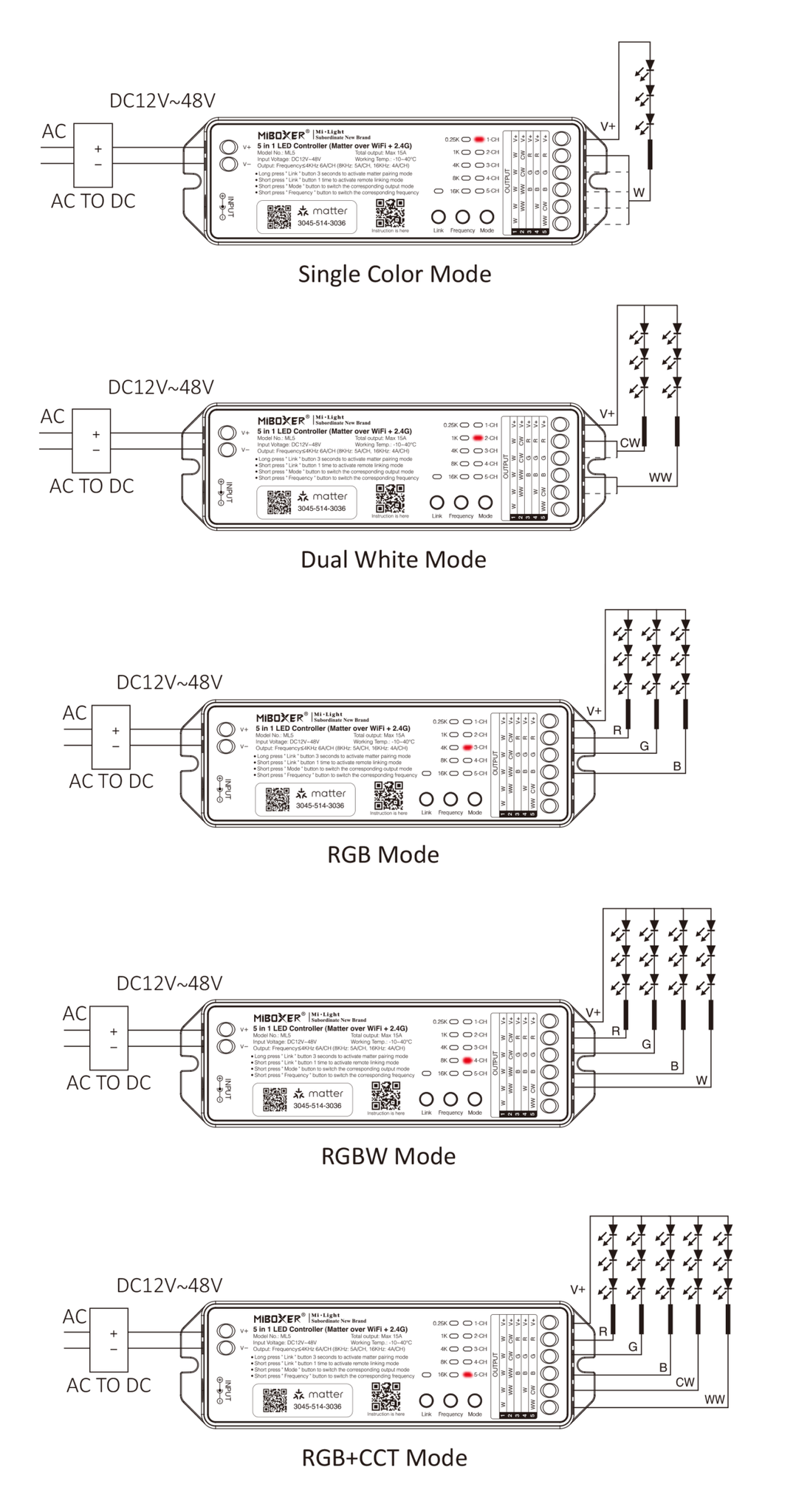 Matter over wifi LED controller 5 in 1 - voor Single Color/Dual White/RGB/RGBW/RGBWW/RGBCCT LED strips 12-24-48v - ML5