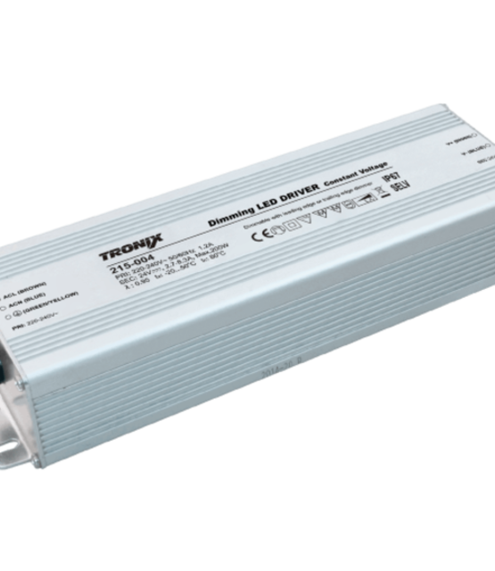 Waterdichte dimbare LED voeding. Geschikt voor LED dimmers met fase afsnijding of fase aansnijdig. Ook wel triac genoemd. Maximaal wattage 200 watt en geschikt voor binnen en buiten. 5 jaar garantie
