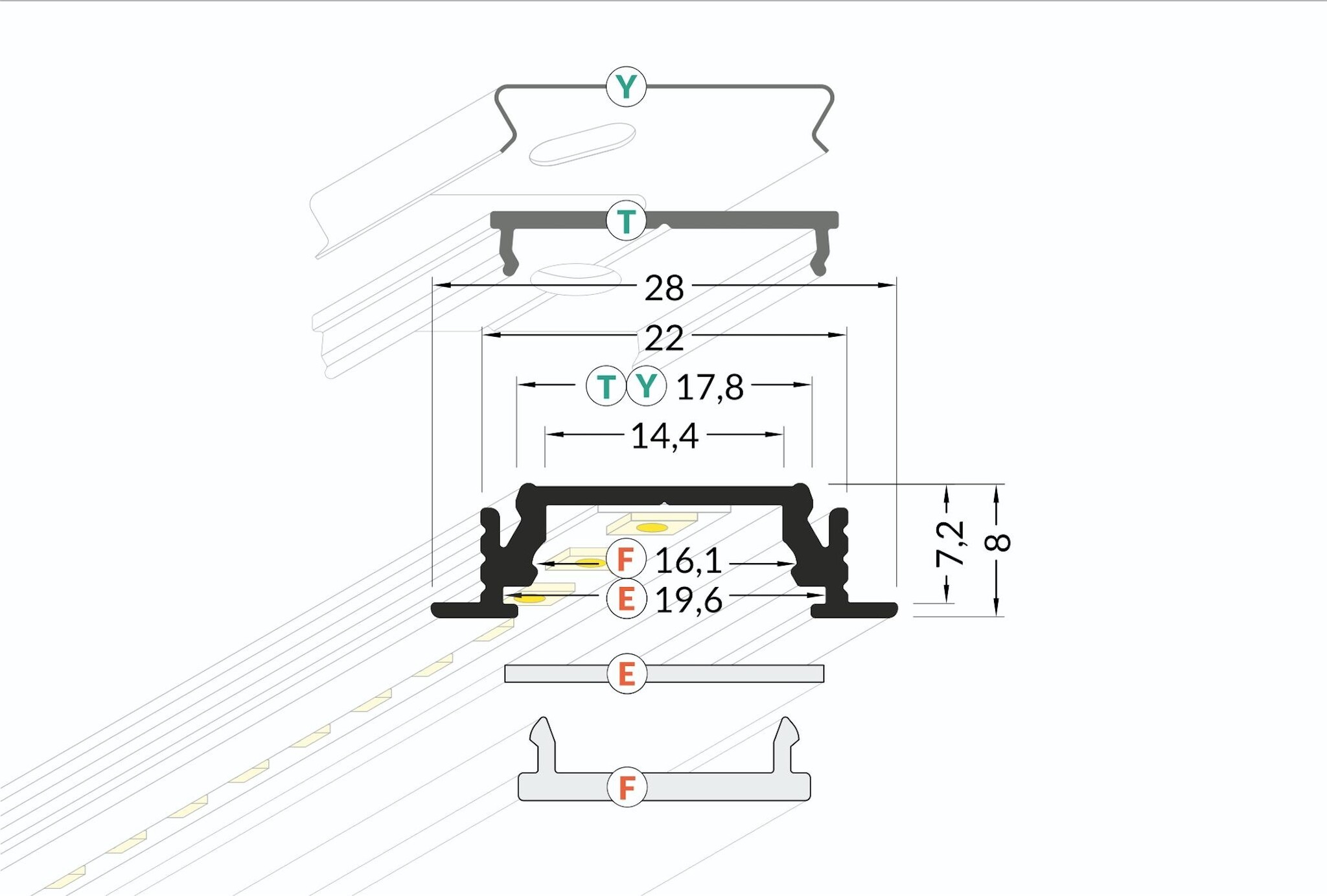 - Materiaal LED profiel: geanodiseerd aluminium / wit poedercoat